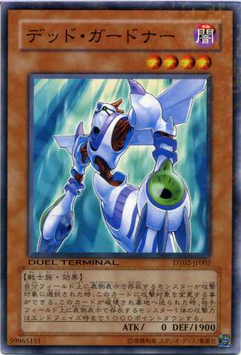 遊戯王カード デッド・ガードナー DT02-JP002 価格: 50円 レビュー評価: 0.0 レビュー数:0 遊戯王OCGデュエルモンスターズ DUEL TERMINAL シングルカードデッド・ガードナー デュエル ターミナル ワームの侵攻!! DT02-JP002【戦士族・効果】自分フィールド上に表側表示で存在するモンスターが攻撃対象に選択された時、このカードに攻撃対象を変更する事ができる。このカードが破壊され墓地へ送られた時、相手フィールド上に表側表示で存在するモンスター1体の攻撃力はエンドフェイズ時まで1000ポイントダウンする。ATK/ 0 DEF/1900遊戯王シングルカード Supported by 楽天ウェブサービス |